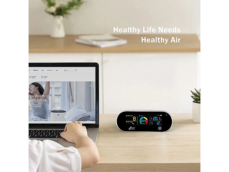- Farb-Display mit Ampelsystem zur Anzeige der Luftqualität: grünes Licht = gut, blaues Licht = mittelmäßig, gelbes Licht = ungesund, rotes Licht = sehr ungesund