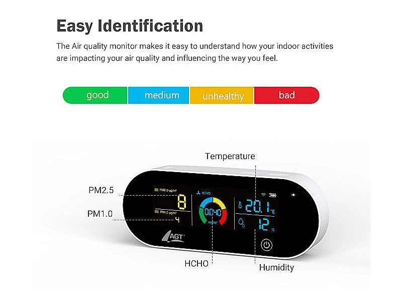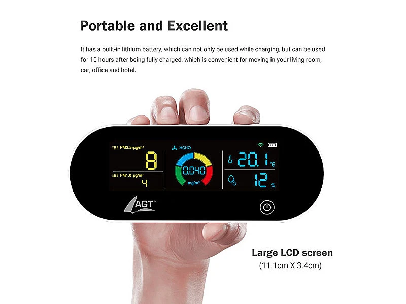 - Messbereich HCHO: 0 – 6,25 mg/m3, PM1/2,5: 0 – 500 μg/m3, Temperatur: -20 ℃ – +50 ℃, Luftfeuchtigkeit: 0 – 99 %