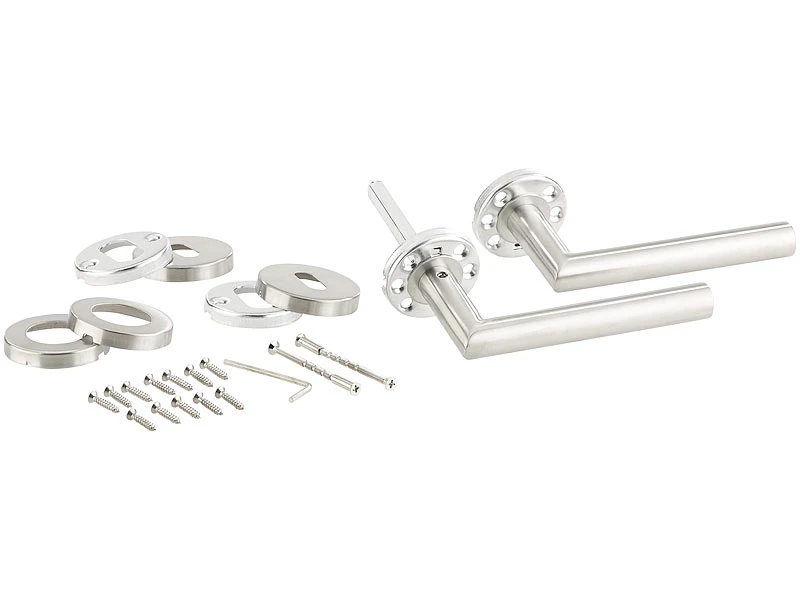 - 2er-Set Türbeschläge inklusive je 2 Türklinken, 2 Klinken-Klipp-Rosetten, Vierkant-Stift, 2 Profilzylinder-Rosetten, 2 Buntbart-Klipp-Rosetten, Montage-Material und deutscher Anleitung