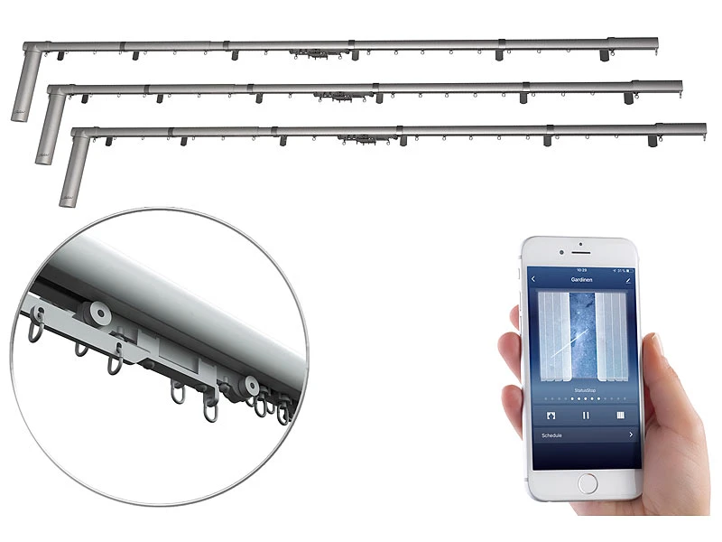 - Automatische Funktionen programmierbar, z.B. Öffnen des Vorhangs bei Sonnenaufgang und Schließen bei Sonnenuntergang