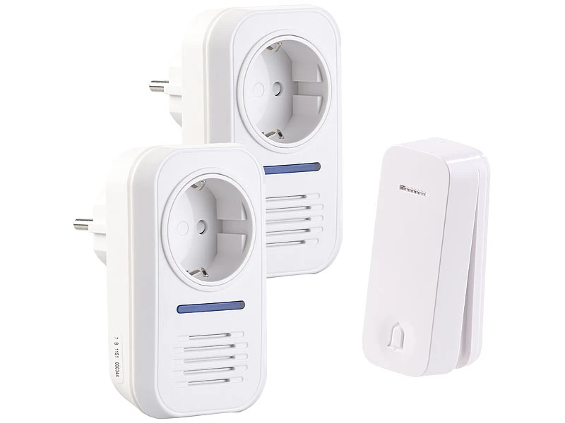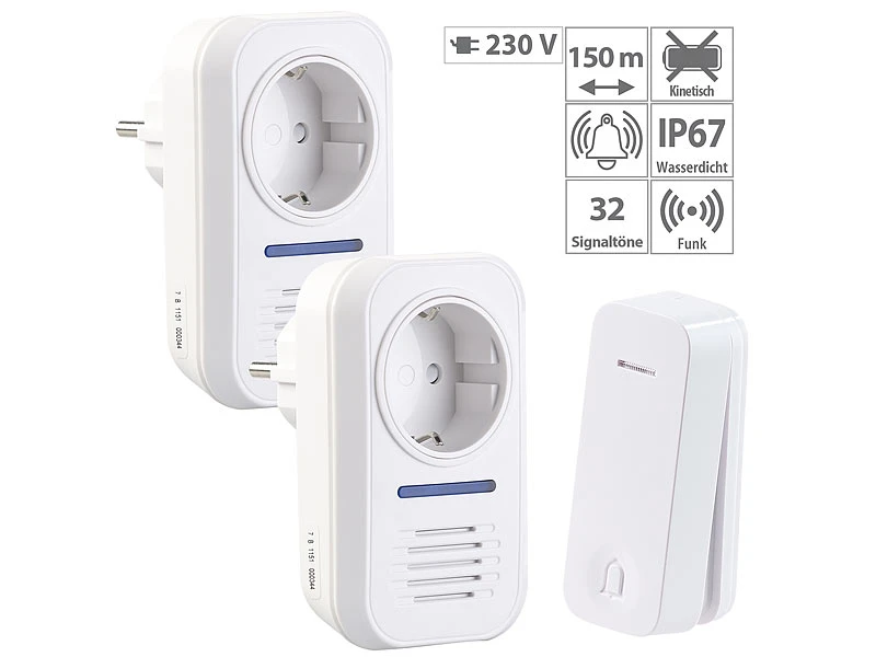 - 2 Funk-Klingeln (Empfänger) inklusive Aufputz-Funktaster, Befestigungs-Material und deutscher Anleitung
