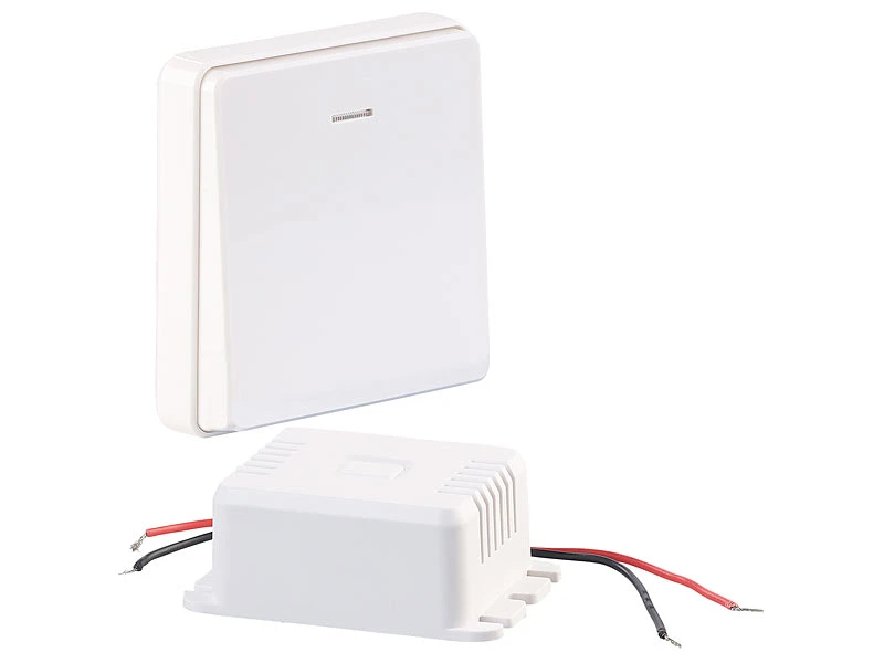 - Funk-Empfänger inklusive Montagematerial, Aufputz-Funktaster, Befestigungs-Material und deutscher Anleitung