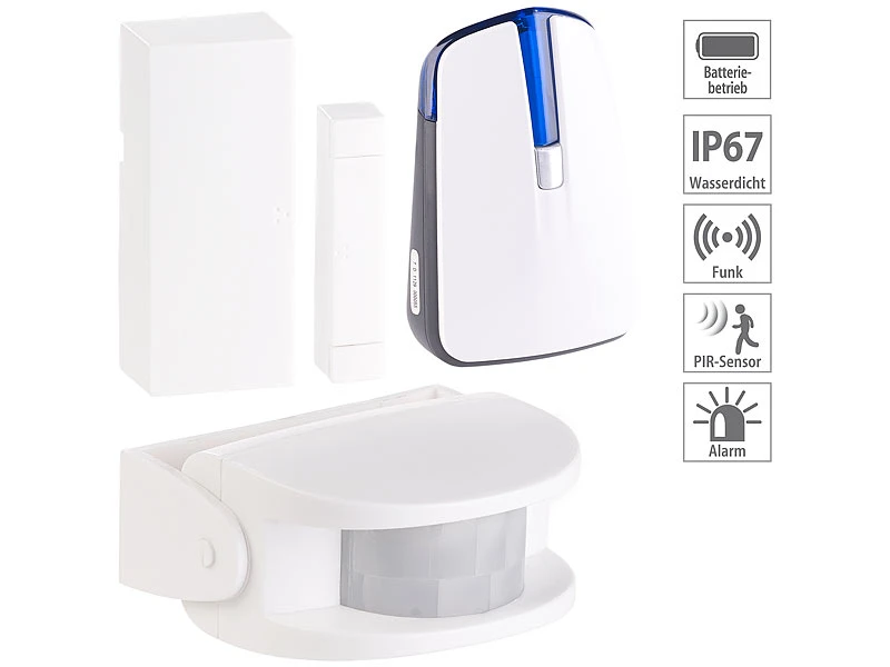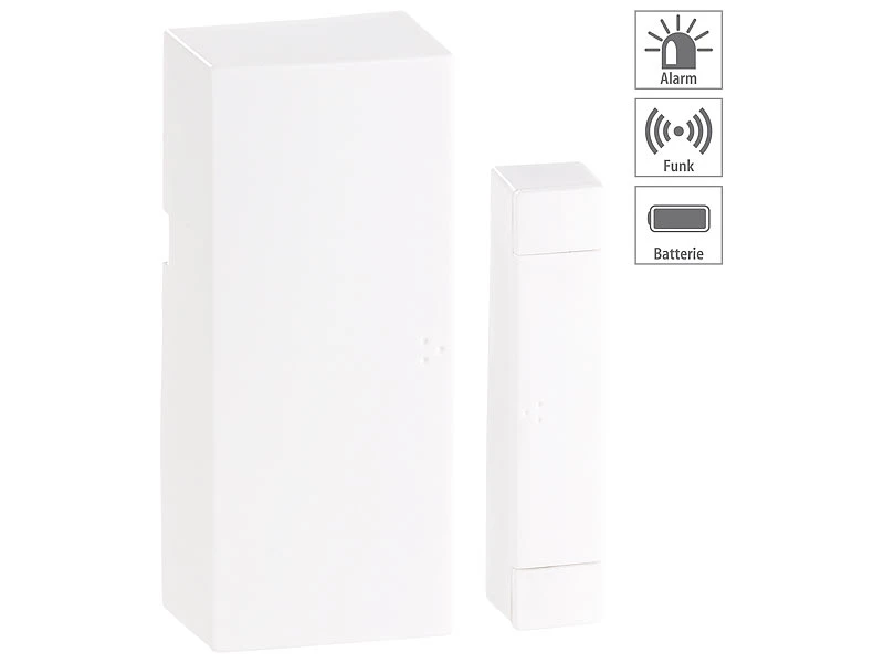 - Alarm-Set: Funkklingel (Empfänger) inklusive Bewegungsmelder, Tür- und Fensteralarm mit Knopfzelle (CR2032), Montagematerial und deutscher Anleitung