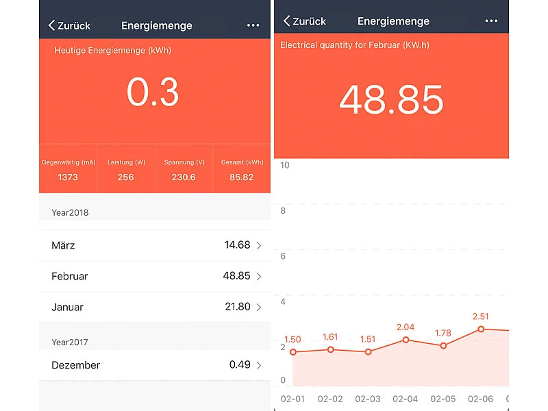 - App misst den Stromverbrauch zuverlässig ab einem Verbrauch von 5 Watt: Milliampere, Volt, Watt, kW/h Tageswert, kW/h Gesamtwert