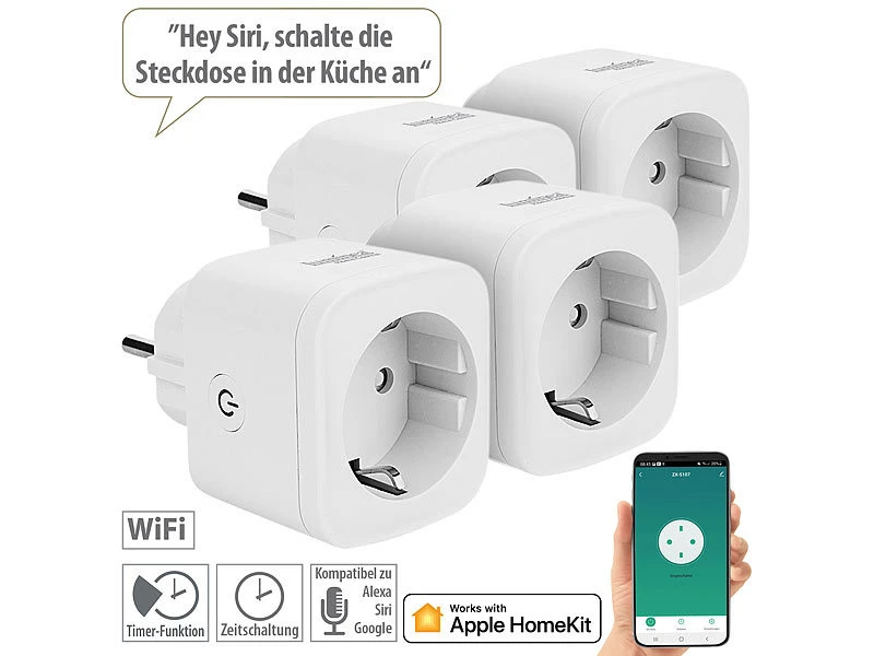 - 4er-Set Apple-HomeKit-zertifizierte WLAN-Steckdosen SF-510 inklusive deutscher Anleitung – WLAN Steckdosen mit App-Steuerung – Außerdem relevant oder passend zu: Zähler, smarte, Stecker