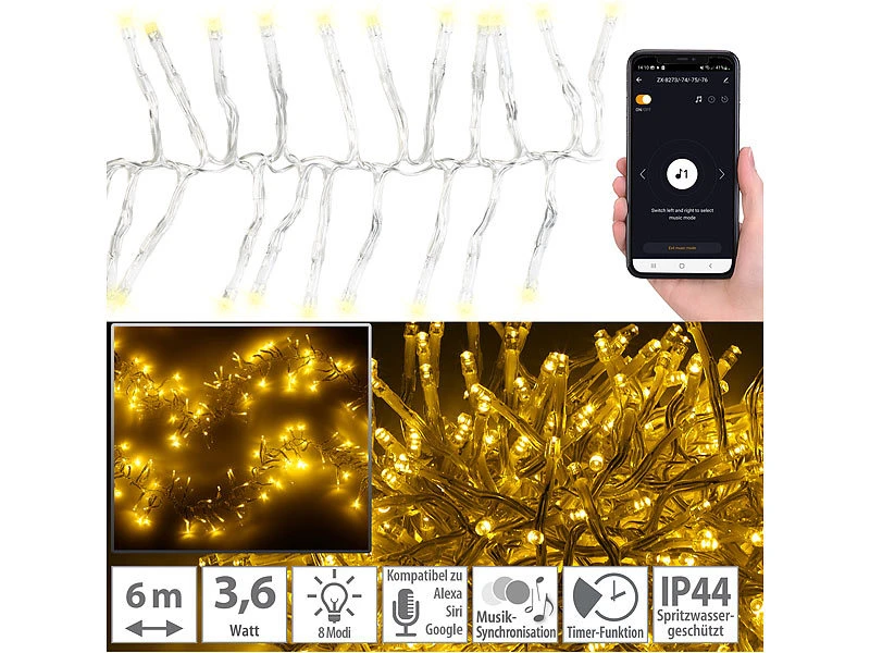 Lunartec LED-Lichterkette Stecker:2er SetLED Wifi Büschel Lichterkette,600warmweiße LEDs,Tuya,dursichtig