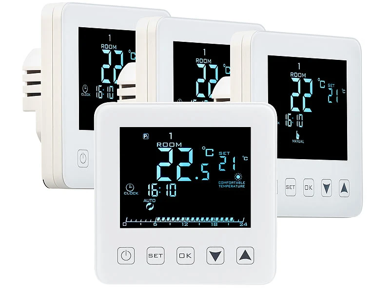 - 4 Thermostate je inklusive externem Sensor, Montagematerial und deutscher Anleitung – Fußbodenheizung Thermostat Digital – Außerdem relevant oder passend zu: WC, Switch, Wellness, Toiletten, Badezimmer, Programmierbare