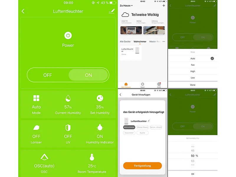 - 2 Betriebs-Stufen: Ventilator (für Luft-Umwälzung), Smart (stromsparende Automatik für 55 % Luftfeuchtigkeit)