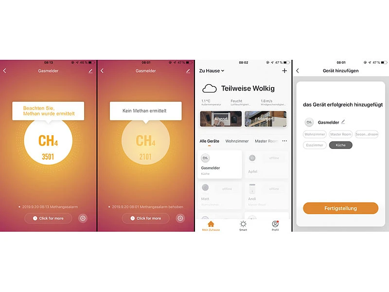 Zusätzliche Sprach-Ansage: Bei zu hoher Gas-Konzentrationen warnen die Geräte Sie zudem mit einer Ansage vor austretendem Gas. So können Sie schnell die Gaszufuhr ausstellen und für eine gründliche Belüftung der Räume sorgen.