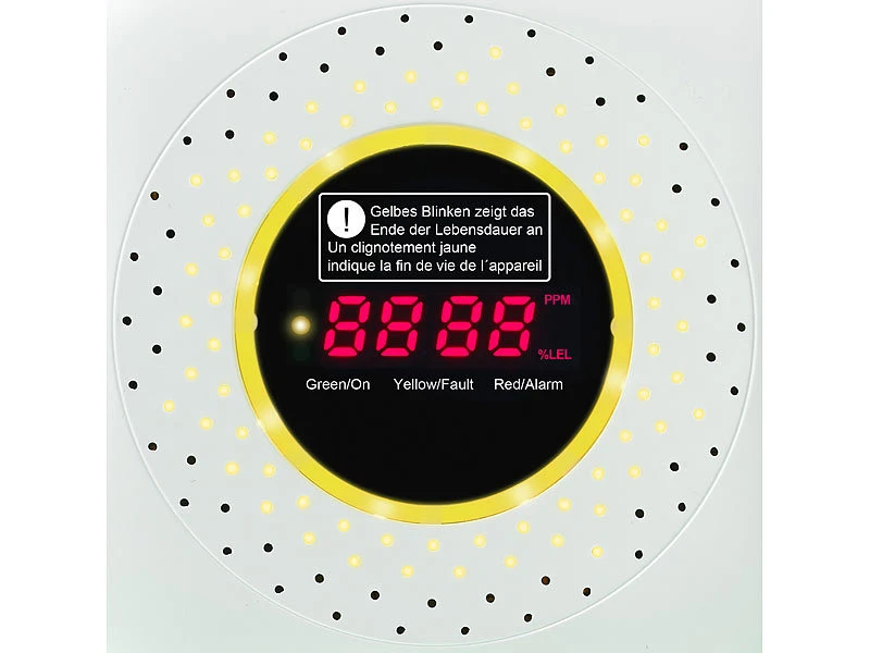 - Beendet Alarm automatisch bei entsprechend gesunkener Gas-Konzentration, manuelle Stumm-Schaltung bei Fehlalarm möglich