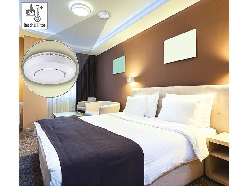 Sichere Alarmierung bei Feuer: Die Kombination aus Rauch-Erkennung und Hitze-Sensor sorgt für eine zuverlässige und schnelle Erkennung von Bränden. Selbst langsam aufkommende Schwelbrände werden frühzeitig erkannt.