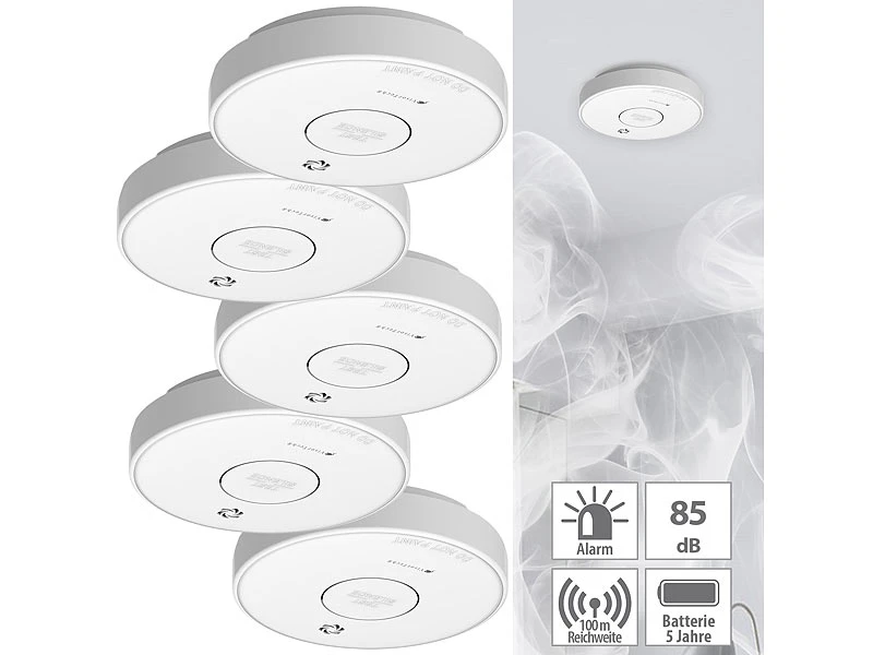 - 5er-Set Rauchwarnmelder RWM-470 inklusive je 2 Batterien, Montagematerial und deutscher Anleitung – Funkgesteuerte Rauchmelder – Außerdem relevant oder passend zu: Melder, vernetzt, Vernetzte