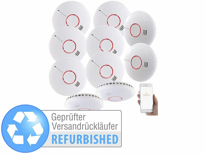 - 10 Hitze- und Rauchwarnmelder RWM-200.app je inklusive 2 Batterien, Montagezubehör und deutscher Anleitung