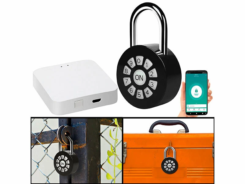 - Maße Metall-Vorhängeschloss: 80 x 50 x 21 mm, WLAN-Gateway: 57 x 57 x 22 mm